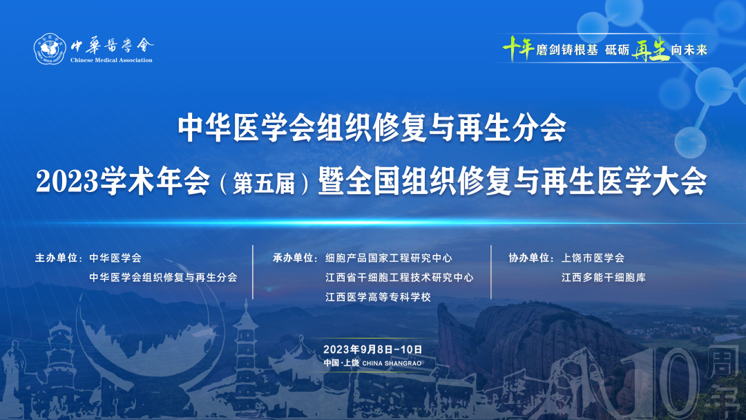 中华医学会组织修复与再生分会2023学术年会(第五届)暨全国组织修复与再生医学大会9月8日至10日在江西上饶召开。会议由中华医学会和中华医学会组织修复与再生分会主办,细胞产品国家工程研究中心、江西医学高等专科学校、江西省干细胞工程技术研究中心等单位联合承办。